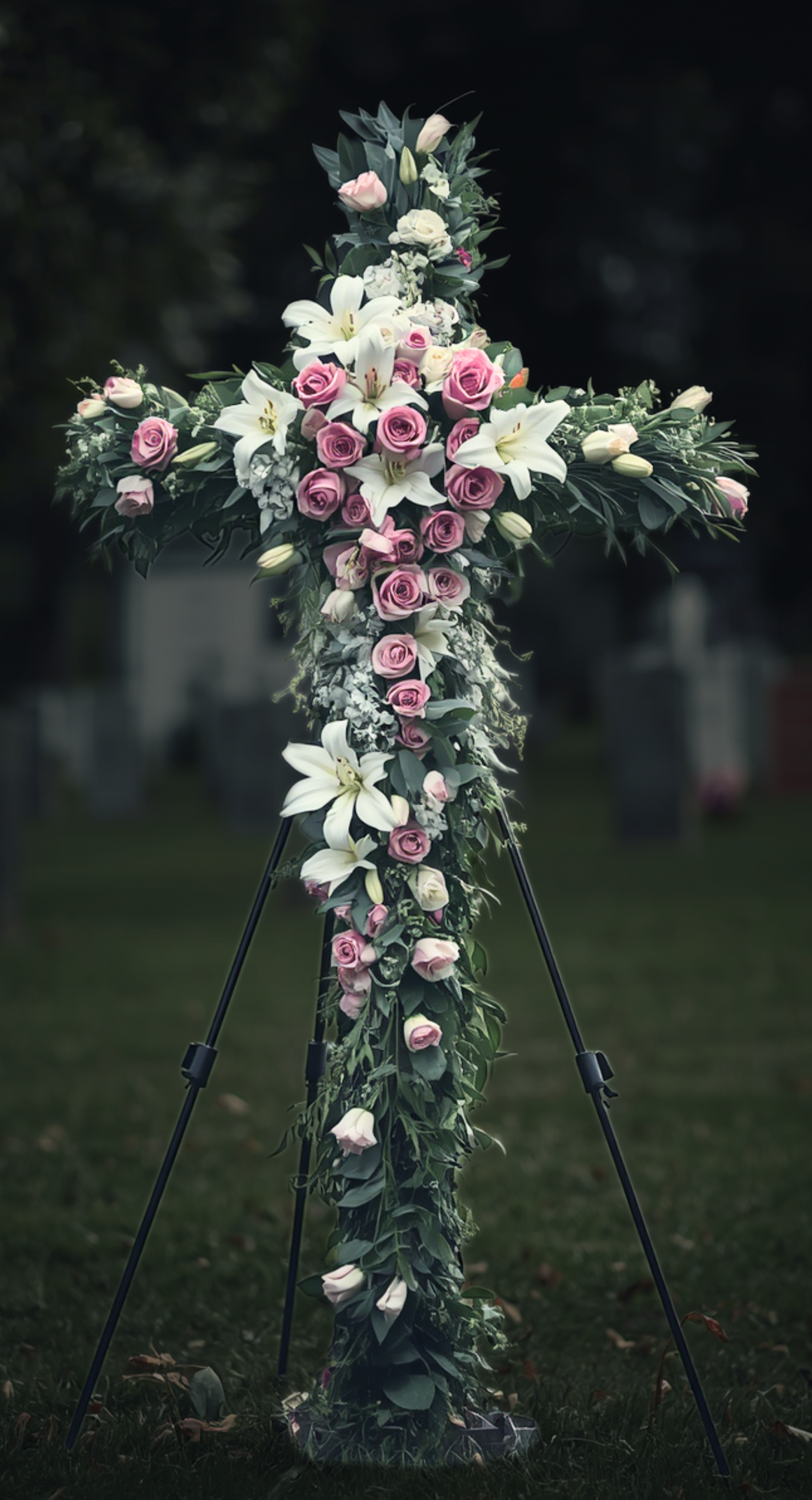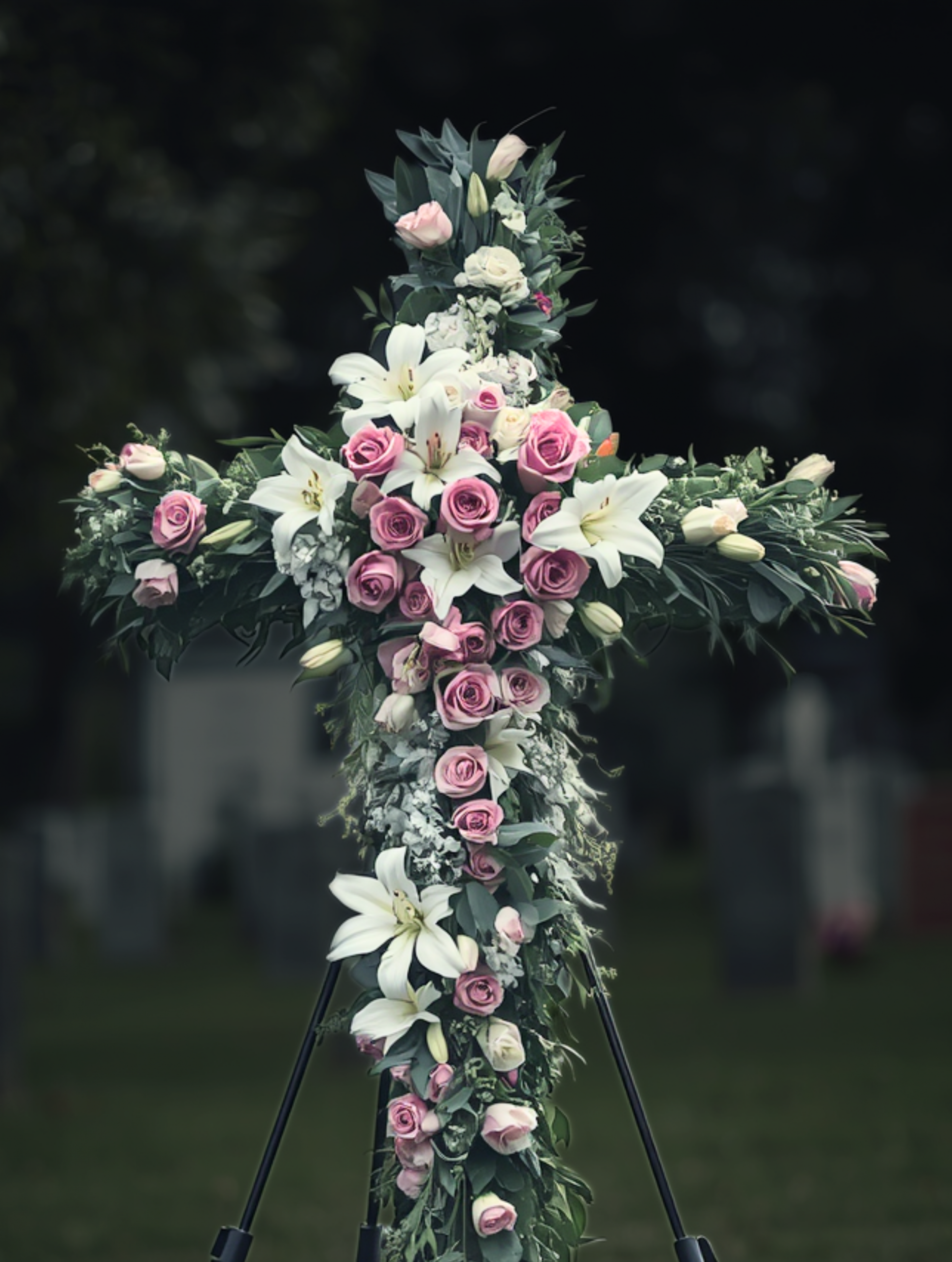 Handcrafted with fresh premium flowers — such as lilies, soft roses, and lush greenery — it creates a peaceful and lasting expression of love and remembrance.