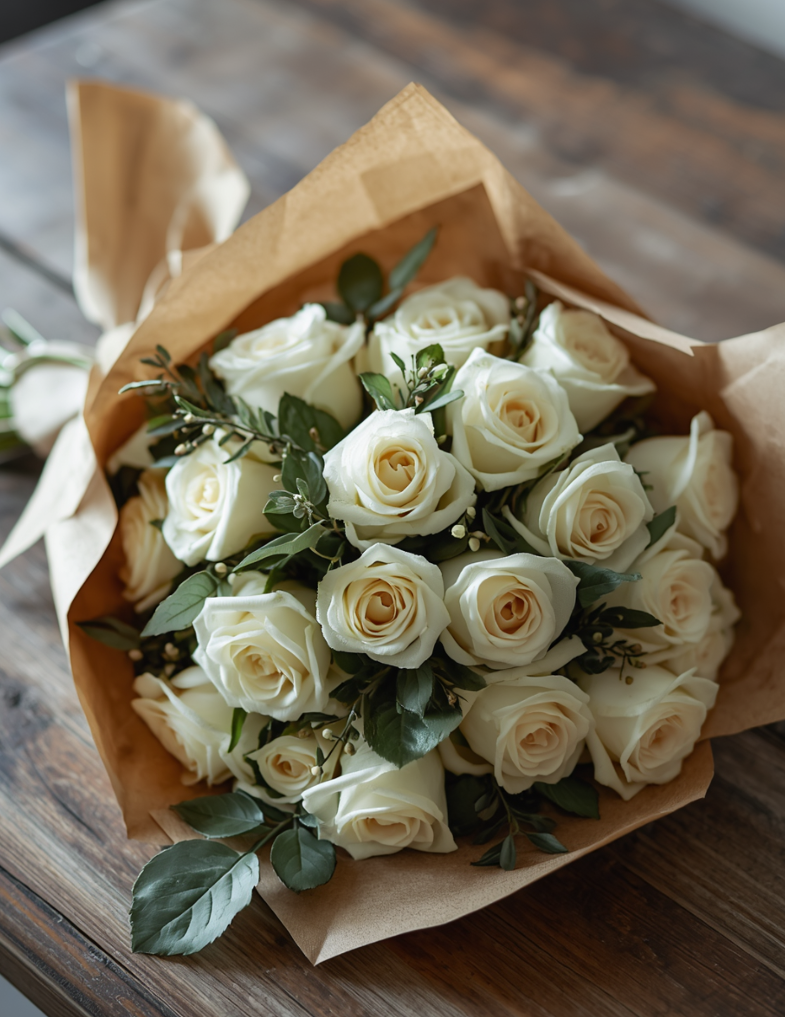A classic and timeless gift — one dozen beautiful long-stem white roses, elegantly wrapped in rustic kraft paper and finished with a simple ribbon.